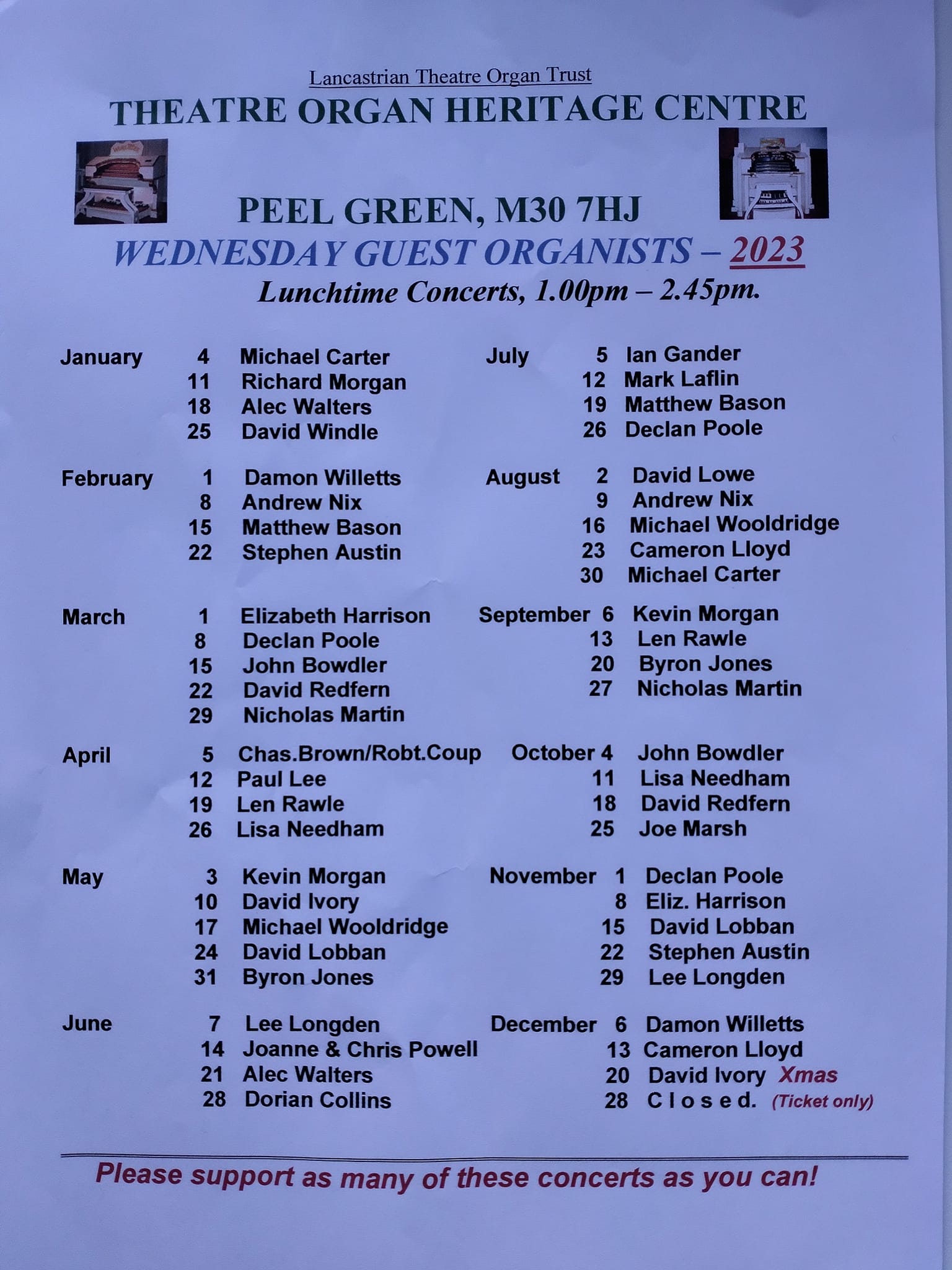 Wurlitzer/Compton Showcases With Featured Organists Every Wednesday 1-00pm - 2-30pm - £7.50 Unreserved Seating Doors Open 12:00 noon - Hot & Cold Refreshments Programme subject to alteration Your contact -- Roger Fisher - 0161-264-9039 - rcfgromit@btinternet.com |